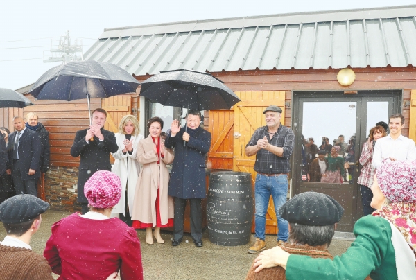 马克龙总统和布丽吉特在图尔马莱山口“牧羊人驿站”迎接习近平和彭丽媛,共同欣赏当地村民表演的具有浓郁南法风情的牧羊人之舞,并同他们亲切合影。