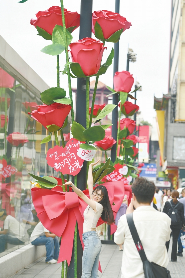 5月20日,长沙市五一广场,市民在巨型玫瑰花前拍照。“520”谐音“我爱你”,长沙街头多处可见表达爱意的浪漫布景装饰。