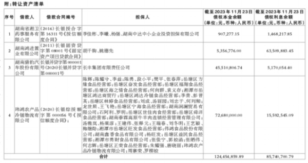 注:1、本公告清单列示暂计至2023年11月23日的贷款本金余额,借款人和担保人应支付给中国中信金融资产管理股份有限公司湖南省分公司的利息按借款合同、担保合同、中国人民银行的有关规定以及法院裁判文书计算。