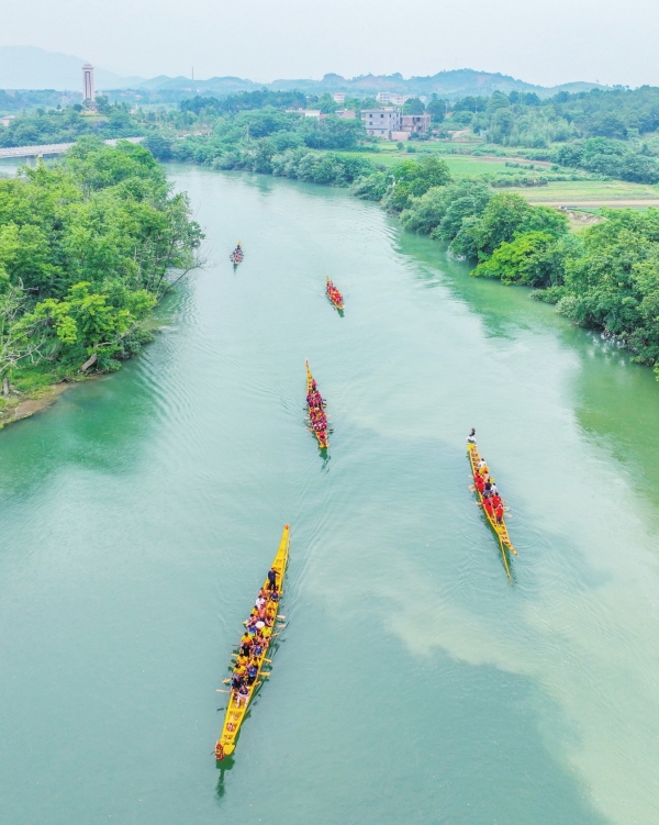 5月22日,道县梅花镇贵头村, 龙船滑行在洑水河上。近年,该县通过创建“美丽河湖”,打造水清岸绿的水生态景观。