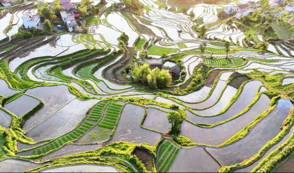 5月19日,海拔1000余米的新宁县舜皇山插旗岭上,横铺梯田纵横阡陌,层次分明,线条行云流水,勾勒出一幅美丽田园画卷。鄢跃斌 摄(湖南图片库)