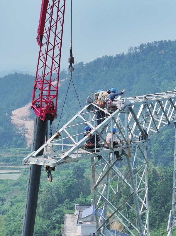 5月23日,湘乡市月山镇,湖南民丰-湘潭西第三回500千伏线路工程现场,湖南送变电工程公司员工正开展山地机械组塔。该工程是2024年湖南电网“迎峰度夏”重点工程之一,线路全长48.429千米,新建杆塔120基。