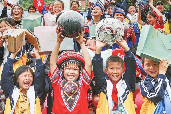 5月28日,临武县西山瑶族乡中心小学,学生开心地展示领取的礼物。当天,临武县委统战部开展“爱洒瑶族乡 情系下一代”活动,志愿者为该校80名留守儿童圆梦微心愿,赠送生日蛋糕、少儿书籍、足球、衣服等,让他们切身感受社会大家庭的温暖。 陈卫平 邝文忠 摄影报道(湖南图片库)