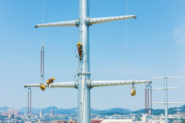 5月28日,娄底经开区产业园民华线迁改现场,工人在安装绝缘子。近期,国网娄底星源电建集团全力推进220千伏民华线迁改工程,该项目是当地“迎峰度夏”的重点工程之一。吴永华 摄(湖南图片库)