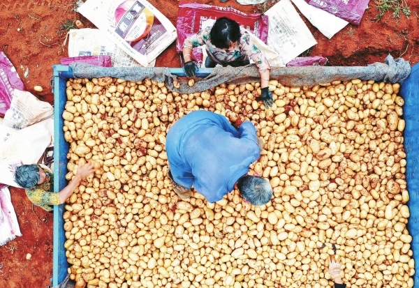 5月29日,嘉禾县龙潭镇康源农场,村民在采收土豆。时下,该农场200多亩优良土豆进入成熟期,村民抢抓农时采收上市。近年,当地采用“轮种+连片”方式种植土豆、冬瓜等农作物,让土地资源得到充分利用,增加集体经济,带动村民增收。黄春涛 摄(湖南图片库)