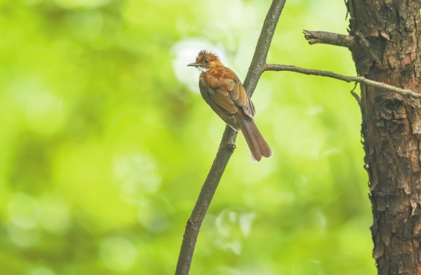 6月10日,长沙市岳麓区八方公园,栗背短脚鹎栖息枝头。栗背短脚鹎头顶上羽冠造型奇特,主要以果实与种子为食,也吃昆虫。湖南日报全媒体记者 张京明 摄