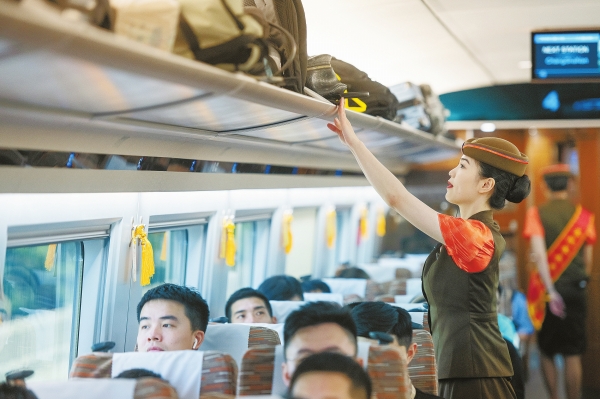 6月15日,在武汉至深圳北的G875次列车上,乘务员在整理行李架。新华社 发