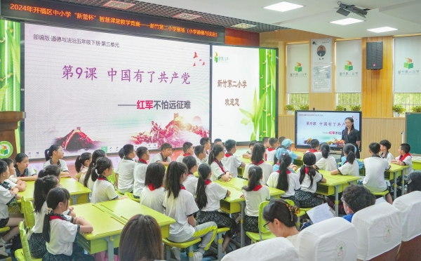 6月20日,2024年长沙市开福区中小学“新蕾杯”智慧课堂教学竞赛道德与法治教学决赛在新竹第二小学举行,7位青年教师结合学生特点以及教学目标,进行了道德与法治教学的展示。