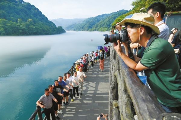 6月23日,资兴市东江湖旅游区,摄影师在“雾漫小东江”景点拍摄美景。6月21日至23日,湖南日报组织15名优秀摄影师聚焦资兴开展主题采访创作活动,用镜头记录下东江湖生态旅游资源的美好瞬间,宣传推介资兴的山水美景和人文风情,以摄影助力当地文旅融合高质量发展。