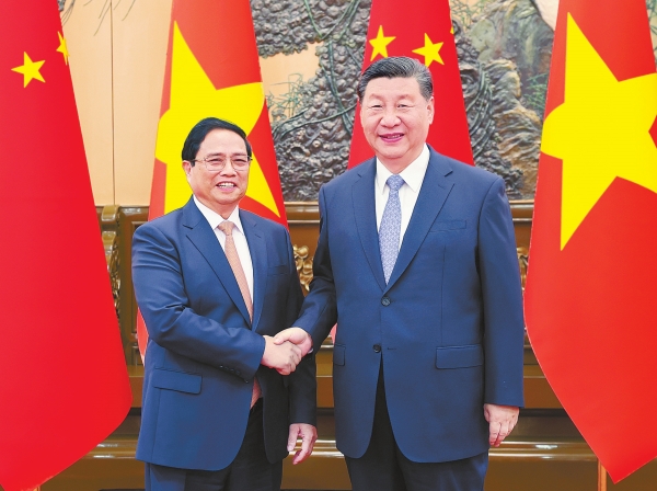 习近平请范明政转达对阮富仲总书记和苏林国家主席的诚挚问候。习近平指出,去年年底我访问越南期间,同阮富仲总书记宣布构建具有战略意义的中越命运共同体,引领两国关系进入新阶段。半年多来,两党两国高层交往密切,各领域合作进展顺利,给两国人民带来实实在在的利益。当前,世界百年变局加速演进,中越保持经济快速发展和社会长期稳定,彰显了社会主义制度的优越性。构建具有战略意义的中越命运共同体,符合两国各自现代化建设需要,有利于维护地区和平稳定,促进世界社会主义事业发展。中方愿同越方加强战略引领,围绕“六个更”总体目标,坚持团结友好,坚定相互支持,深化互利合作,携手迈向现代化,为世界和平、稳定、发展、繁荣作出更大贡献。