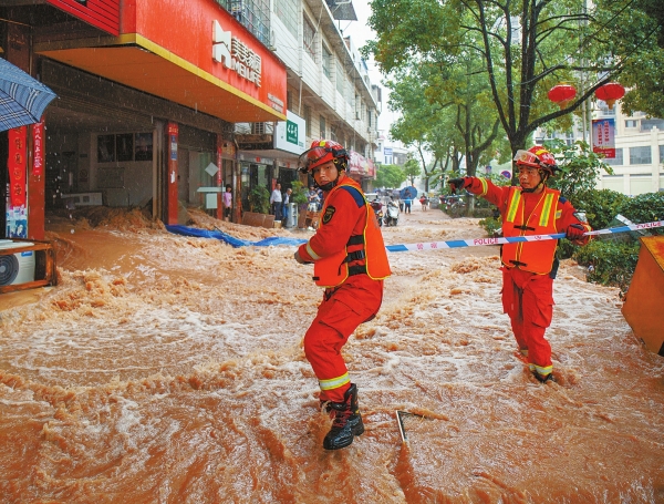 6月25日,消防人员在危险区域拉起警戒线。当天中午12时许,双牌县气象台将暴雨预警信号升级为红色,该县及时调度应急、消防等多个单位构筑挡水子堤,对洪流进行导流,确保排水通畅和人民群众生命财产安全。