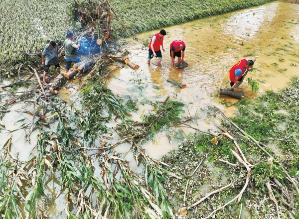 6月26日,道县寿雁镇安村,干群合力在田间清理杂物。受6月25日强降雨影响,该县洑水河流域水位陡涨,沿线乡镇农作物、水产品和农业设施等出现不同程度受损。