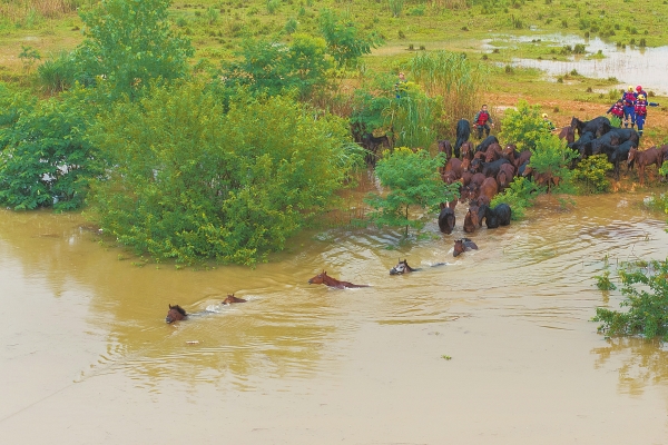 6月26日,马群在救援队帮助下游泳过河。当天,湘江长沙水位出现超警戒洪水,37匹马被困位于靳江河与湘江交汇处南端的柏家洲。岳麓蓝天救援队采取把头马用绳索牵引过河,其他马群跟随过河的方式救援。经过近半个小时的紧张救援,马群被成功转移上岸。
