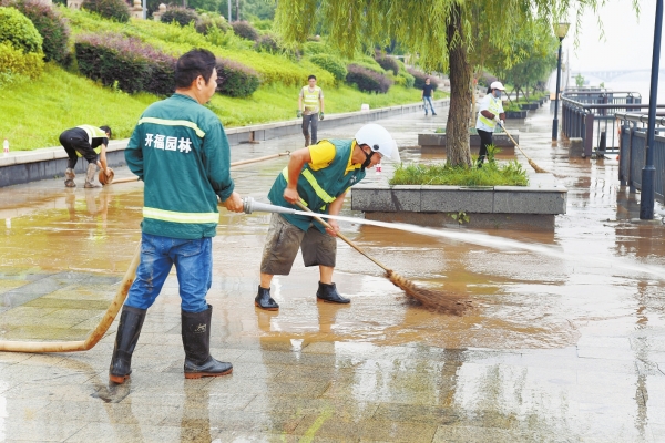 6月28日,长沙市湘江风光带风帆广场南侧,开福区园林工作人员在清理游步道上的淤泥。随着湘江水位下降,长沙主城区各责任单位迅速安排人员,对辖区内湘江风光带上洪水留下的淤泥和垃圾开展全面清理。 湖南日报全媒体记者 田超 摄