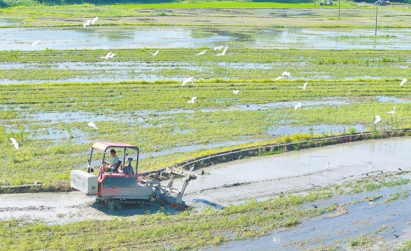 7月5日,衡阳市衡山县白果镇,村民驾驶农机翻耕稻田。小暑节气来临,该镇农民抢抓晴好天气开展早稻收割、晚稻栽种作业,田间地头一派忙碌景象。曹正平 夏建军 摄影报道(湖南图片库)