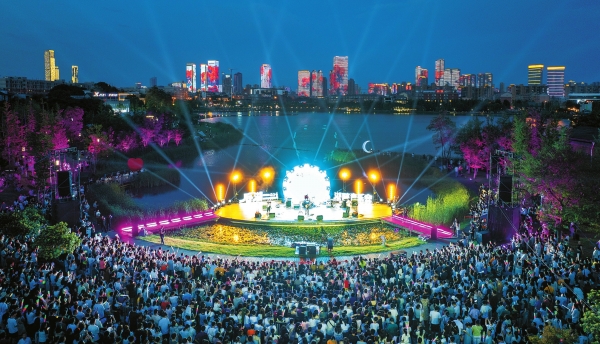 7月14日晚,湖南湘江新区后湖设计创意园西广场,浅海指南乐队在台上演出。当晚,“艺术湘江 文韵新区”2024创意后湖公共艺术年之后湖湖畔音乐会上演,为群众带来丰富的文化体验。湖南日报全媒体记者 辜鹏博 摄