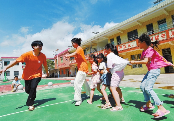 7月14日,嘉禾县晋屏镇宅侯村,大学生、志愿者与留守儿童一起玩游戏。近日,该县团县委联合湖南师范大学、湖南工程学院“三下乡”团队开展社会实践活动,丰富留守儿童暑期生活。 黄春涛 呼延牧梓 摄影报道(湖南图片库)