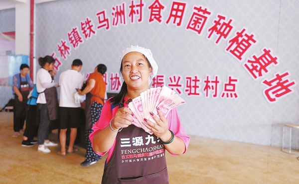 7月11日,古丈县红石林镇铁马洲村,村民张春芝开心地展示领取的工资。当天,该村村企联合集中为23名村民发放上个月的劳务工资,共计4万余元。该村在省科协驻村工作队的牵线下,与山东商会合作,规模化种植黑皮鸡枞菌等食用菌,目前已有两个恒温大棚投产,年产鸡枞菌10万公斤,总产值达170万元。湖南日报全媒体记者 赵持 摄