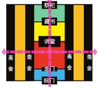 罗明:还是有的。书院功能区的等级不像官学建筑那么严格,但呈现出约定俗成的格局规律。如采取中轴对称,多重院落天井组合,对外封闭,对内开敞的形态。基本格局以讲堂为中心,中轴上一般依次为院门、龙门、讲堂三进标配,同时还根据地形设有藏书楼和祭祀建筑,层层递进,体现了古代文教建筑讲学、藏书、供祀“三大事业”的主体地位。其他次要功能区分列于中轴两侧,以满足居学读书的需要。书院严谨而丰富的建筑组群,正是“礼乐相成”思想的具体表现。总之,官式更重于礼,民间更重于乐,书院则体现两者相成的特点。