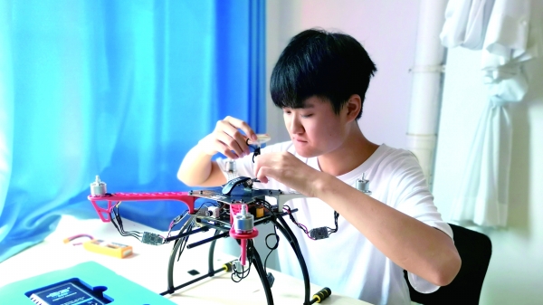 面对无人机这样的新兴技术,张晗熹投入了十二分的努力。缺乏理论知识,他就潜心钻研、多看多问;飞翔技能不够,就夜以继日、勤加练习。别人学习八小时,他只休息八小时,每天从早上七八时练到晚上十一时;为了能跟老师、同学们随时取经,他锻炼语言能力,每天练读课文,直到读准读清晰为止……
