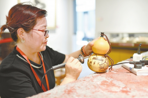 7月16日,长沙市望城区铜官老街,选手参加烙画比赛。当天,由长沙市工艺美术协会主办的长沙市工艺美术大师评审实操和作品陈展活动举行,涉及湘绣、雕塑、陶瓷技艺、工美、茶道、花道、香道等门类。
