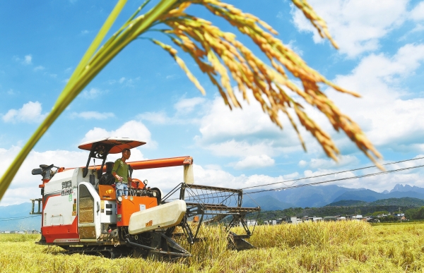 7月22日,江永县潇浦镇接龙桥村,村民驾驶农机在田间收割早稻。当天是大暑节气,该县农民抢抓农时收割早稻、抢插晚稻,田间地头一派农忙景象。