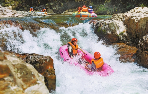 7月23日,通道侗族自治县龙底生态漂流景区,游客在戏水消暑。时值盛夏,森林覆盖率近80%的通道侗族自治县景色宜人,吸引众多游客前来寻觅清凉。