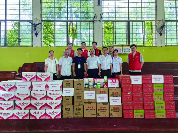 7月5日,岳阳分行工会赶赴平江支行,送上灾后恢复工作和生活急需的水、肉、蔬菜、手套、防暑药品等。