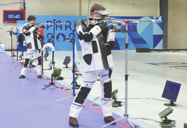 8月1日,刘宇坤在比赛中。当日,在法国沙托鲁举行的巴黎奥运会射击男子50米步枪三姿决赛中,中国选手刘宇坤夺得冠军。