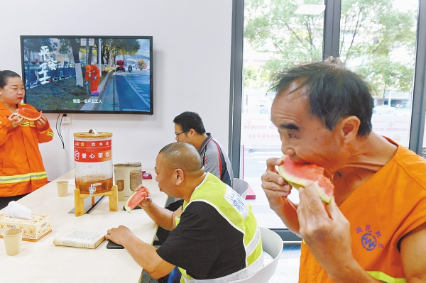8月6日,长沙浦沅社区快递外卖小哥“红色之家”,环卫工人和外卖小哥在吃西瓜。炎炎夏日,长沙市272个配备有空调、凉茶、防暑药品的“红色之家”变身为“清凉小屋”,将清凉送给奔波在城市大街小巷的环卫工人、外卖小哥、的士司机等户外工作者。
