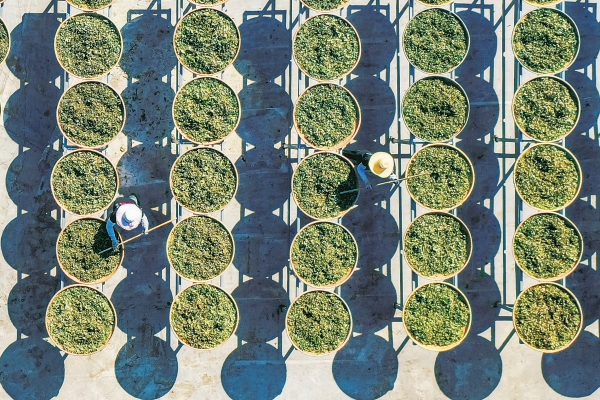 8月7日,蓝山县所城镇所城村瑶浴加工坊,村民在晾晒制作瑶族药浴的中药材。瑶族药浴是瑶民用植物药材烧煮成药水熏浴浸泡以治病健身的一种传统文化习俗,被列为第二批国家级非物质文化遗产。近年来,该县通过“龙头企业+合作社+农户”模式,大力发展药材种植、加工产业,带动村民增收致富。