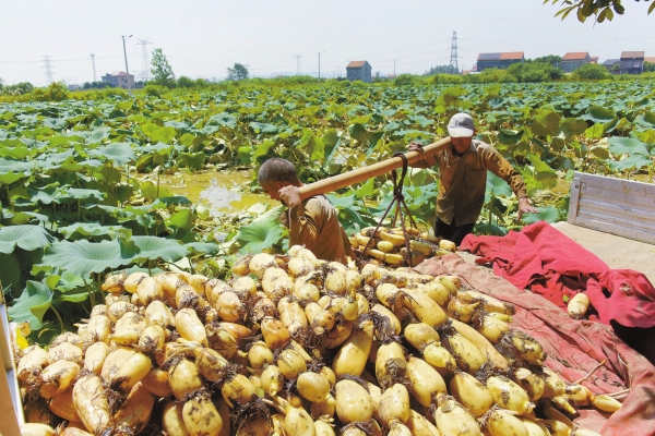 8月7日,澧县涔南镇崔家岗村,农民将采挖的莲藕装车。该镇近年利用低洼田种植早熟莲藕,提高水田种植效率。眼下,早熟莲藕进入采挖期,农民及时采挖供应市场。