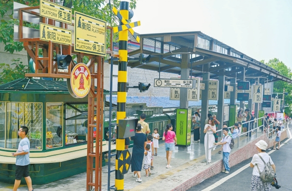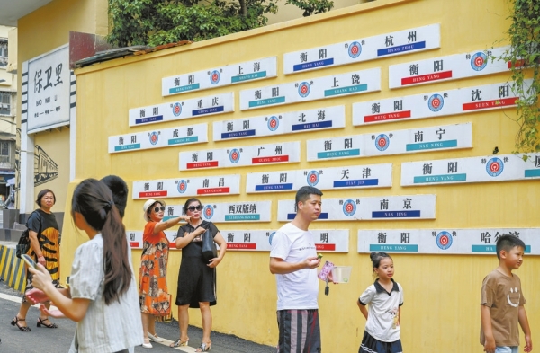 8月14日,衡阳市珠晖区,游客在保卫里文化创意街区观光打卡。今年,该区将保卫里打造成特色文化创意街区,通过对衡阳铁路文化的重塑、社区商圈的自我造血以及保卫里片区的提质改造,实现社区、景区与商区的“完美融合”,打造城市记忆窗口与“潮文化”新地标。 湖南日报全媒体记者 郭立亮 摄