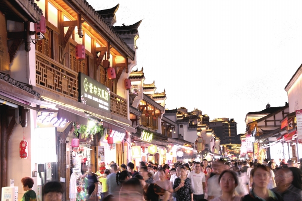 曾经因地势低洼,洪水“光顾”总会被淹没而得名的“河街”,从沅水边“搬迁”至穿紫河畔,按史料复建的麻阳会馆、鸳鸯走马楼等建筑气势恢弘,传统的常德丝弦、桃源刺绣、麻质画等非遗元素,美味的常德米粉、擂茶、桃酥等风味小吃,让这座城市拥有了可以承载乡愁的地方。