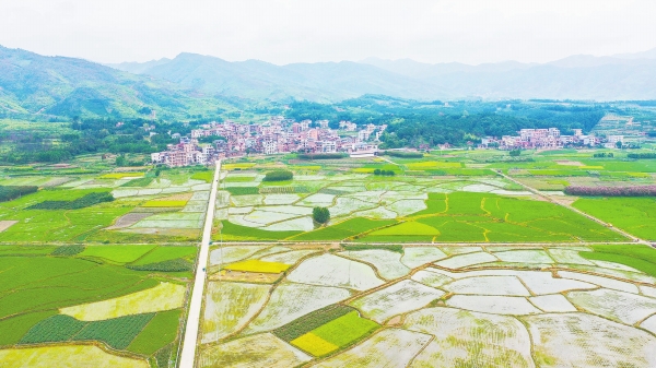 8月15日,新田县骥村镇黄公塘村,稻田与阡陌交通、乡村民居相互映衬,景美如画。刘贵雄 刘嗣民 摄影报道(湖南图片库)