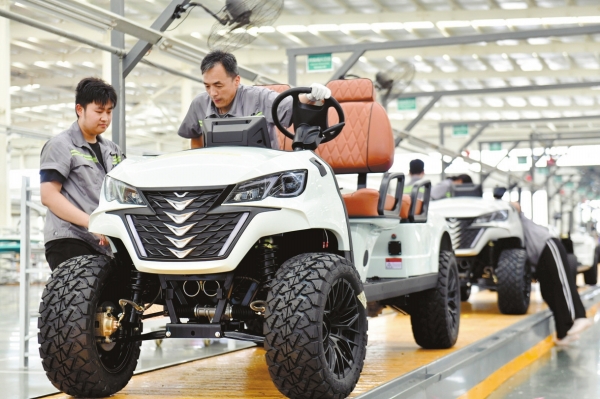 图为7月24日,在山东永利新能源车业有限公司,工作人员在流水线上生产高尔夫球车。新华社 发