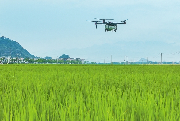 8月20日,道县原地正禾农场,无人机在进行“飞防”作业。临近处暑,当地农民抢抓农时,有序开展秋收、秋种、秋管等农事活动。蒋克青 摄(湖南图片库)