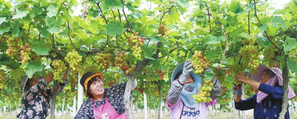8月19日,通道侗族自治县万佛山镇坪地村,村民在葡萄园进行坏果处理作业。时下葡萄进入挂果期,当地村民忙着开展管护工作,确保丰产丰收。李尚引 摄(湖南图片库)
