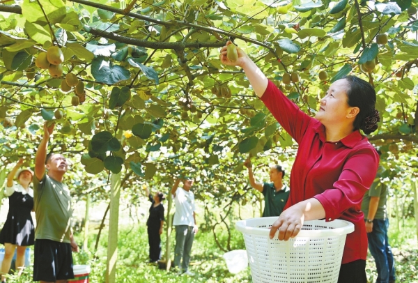 8月20日,绥宁县长铺子苗族侗族乡枫香村,村民在采摘猕猴桃。近年,绥宁农商银行通过“乡村振兴兴农贷”服务,加大对农村种植业信贷资金投放力度,解决农民扩大种植规模的资金需求,助推种植业规模化发展。 滕治中 向洁萍 摄影报道(湖南图片库)