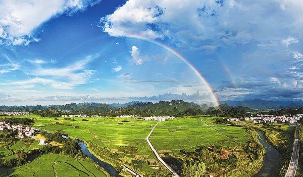 8月23日,宁远县湾井镇下罐村,雨后彩虹与大田晚稻相得益彰,勾画出一幅美丽的田园风景。