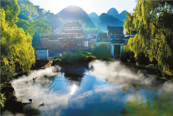 江永县兰溪瑶族乡勾蓝瑶寨,古民居与池塘、水鸭、村道、树林在霞光的映照下熠熠生辉,美如画卷。黄海 摄(湖南图片库) |
