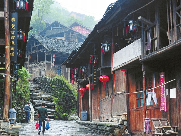 通道侗族自治县双江镇芋头村,村民行走在古色古香的侗寨里。湖南日报全媒体记者 李健 摄 |