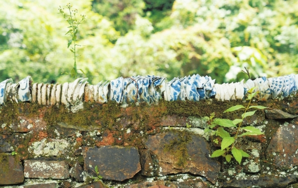 醴陵市沩山镇沩山村,月形湾古窑遗址墙头摆放的瓷器。湖南日报全媒体记者 辜鹏博 摄 |