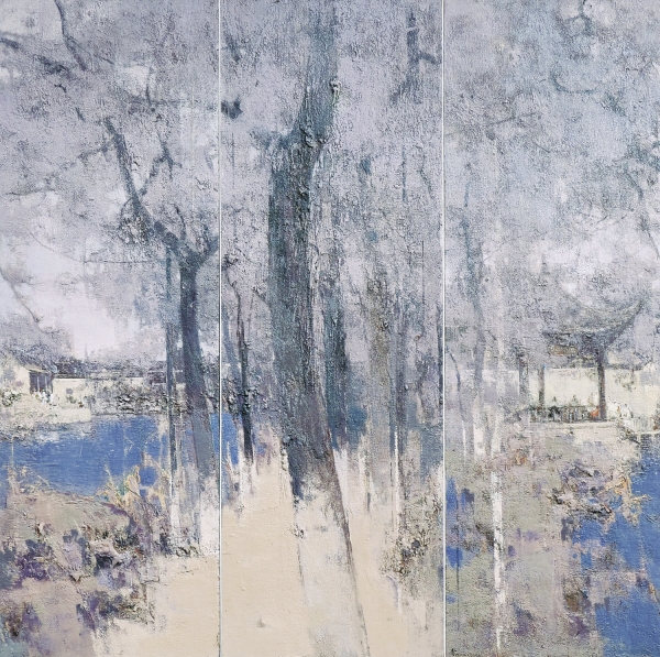 在作品中,我选择了江南古典园林作为主题。园林追求的是人与自然、建筑与自然的和谐,我喜欢这种环境。但我不想让观众的印象定位在某个具体的江南景点上,而想传达一种静谧的、宁静的、诗性的、儒雅的、厚重的整体气质。我相信不同的人看到这幅画都会有似曾相识的感觉。