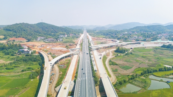 8月26日,醴娄高速娄底互通建设现场,各种大型机械设备、运输车辆来回穿梭,一派忙碌景象。醴娄高速起于醴陵,终于娄底市娄星区,全长154公里,娄底互通长4.252公里,连通了沪昆、娄新、醴娄三条高速公路,是目前全省最大的高速公路互通。吴永华 摄(湖南图片库)
