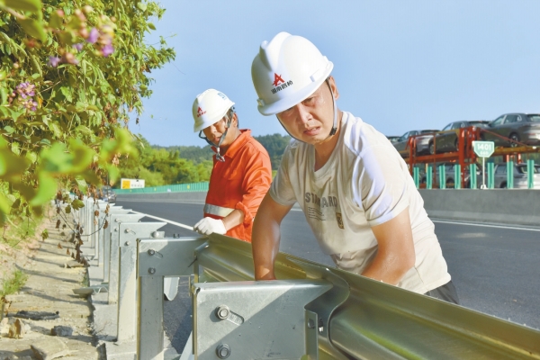 8月25日,G60沪昆高速公路邵阳至怀化大修工程二标1401公里处,施工人员抓紧安装安全护栏,冲刺“8.29”通车节点。杨锡建 李林 摄影报道(湖南图片库)