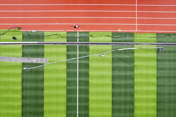 8月29日,平江县桂花学校,工人对操场的人造草坪进行修复。