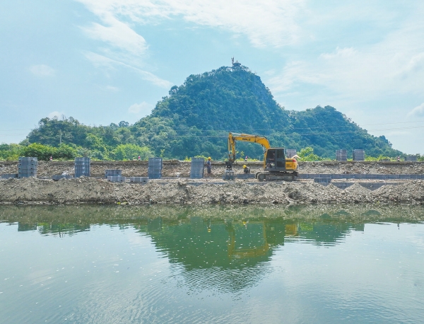 8月29日,道县清塘镇久佳村濂溪河沿岸,施工人员在进行防护堤岸施工。连日来,该县抢抓枯水期积极开展河道整治、堤岸护坡等水利工程建设,确保汛期安全度汛,保障河岸安全。蒋克青 于孝波 摄影报道(湖南图片库)