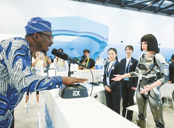 图为当日,一名非洲记者(左一)在峰会新闻中心同智能语音机器人互动。
