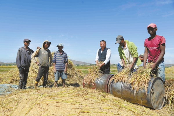 在马达加斯加首都塔那那利佛附近的马义奇镇,中国杂交水稻技术专家胡月舫(右三)在中国国家杂交水稻工程技术研究中心非洲分中心的试验田里和当地农民一起收获水稻(资料图片)。